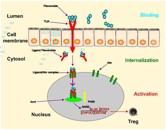 The aryl hydrocarbon receptor (Ahr) is located primarily in lymphocytes and dendritic cells of the intestinal mucosa and plays a role as an intracellular transcription factor for the actions of flavonoids [82] (see Figure 4). During digestion in the gastrointestinal tract, flavonoids are broken down into smaller molecules. Once these molecules enter the intestinal lumen, they bind to the toll-like receptor (TLR) on the plasma membrane and are transferred to the cytosol. As a ligand, they then bind to the Ahr, which triggers its translocation to the nucleus. Through dimerisation with the Ahr nuclear translocator (Arnt) protein, the flavonoid-Ahr-Arnt complex binds to the Ah response element (AhRE) located in the 5V flanking region of various genes, activating the target genes. These genes can regulate the expression of cytochrome P-450, regulatory T cells, STAT3, and interleukin-22 (IL-22), of which IL-22 is crucial for maintaining intestinal integrity and increasing the production of mucus and beta-defensin-2 [83]. Flavonoids act as important immunomodulators, inducing a beneficial pattern of cytokines and immune cells that counterbalance the inflammatory changes in the intestinal mucosa [82].
