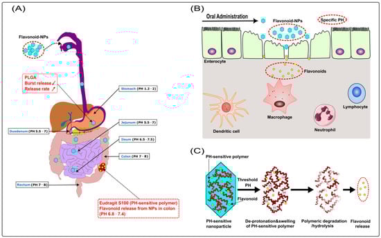 In order to improve the bioavailability of flavonoids in vivo, scientists focus on improving some metabolic processes related to bioavailability, including increasing intestinal absorption [87], enhancing metabolic stability [88], transferring absorption site [89], and so on. To achieve the above goals, nano-delivery systems have been applied to flavonoids. Recently, with the development of biodegradable polymers, flavonoid-loaded polymeric NPs have increasingly become the therapeutic option targeting IBD, which can promote stability and absorption and also change the absorption site (see Figure 3B).
