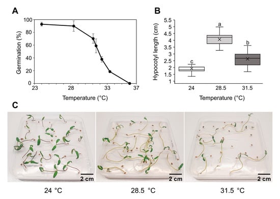To determine the effect of elevated temperatures on tomato seed germination, stratified seeds were incubated for 8 days at a constant temperature ranging from 24 °C to 37 °C. Germination was completely blocked at 36 °C (Figure 1A). Higher temperatures (≥28 °C) correlated with a reduced germination rate and influenced seedling development. Cotyledon size was reduced at temperatures higher than 24 °C, while hypocotyl length increased (Figure 1B,C). The average hypocotyl length of 8-day-old seedlings germinated at 28.5 °C and 31.5 °C was 4.1 cm and 2.6 cm, respectively, representing a significant difference compared to the length of 1.9 cm in seedlings germinated at 24 °C.