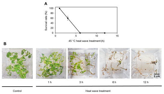 Heat stress tolerance in tomato seedlings. Twelve-day-old seedlings were exposed to 45 °C for 1, 3, 6 and 12 h. Control plants were kept at 24 °C. Survival rates (A) were estimated following a 7-day recovery period (Figure S1A). Green seedlings still producing new leaves were scored as survived. Pictures were taken after the 7-day recovery (B). Each biological replicate consisted of 15 seedlings. Data represent the mean of 3 replicates with standard deviations denoted by vertical bars. The scale bar is 2 cm.