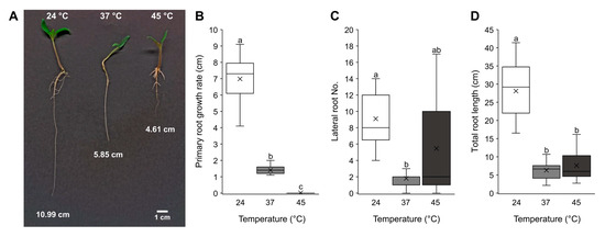 Heat treatments disturbed root development by significantly inhibiting primary root growth and disturbing lateral root development (Figure 3). At 37 °C, lateral root formation was extremely reduced, and primary root growth was inhibited. By contrast, the 45 °C treatment compromised lateral root initiation less but arrested primary root growth (Figure 3A–C). Both treatments significantly reduced total root length (Figure 3D).