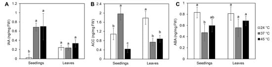 Phytohormone levels in tomato seedlings and adult plant leaves. Seedlings or adult plants were treated either continuously at 37 °C or 45 °C followed by recovery. Control plants were kept at 24 °C (Figure S1C,D). (A) Indol-3-acetic acid (IAA), (B) 1-aminocyclopropane-1-carboxylic acid (ACC) and (C) abscisic acid (ABA) were measured from whole seedlings or leaves harvested 24 h from the start of the treatments and expressed per fresh weight (FW). Each biological replicate consisted of 15 seedlings or leaves pooled from 6 adult plants. Data represent the average of 3 replicates with standard deviations denoted by vertical bars. Different letters indicate a significant difference between control and heat treatments at p < 0.05 (Tukey’s test) for each tissue type separately.