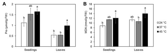 Proline (Pro) and malondialdehyde (MDA) content in tomato seedlings and adult plant leaves under heat stress. Seedlings or adult plants were either treated continuously at 37 °C or at 45 °C followed by recovery. Control plants were kept at 24 °C (Figure S1C,D). Pro (A) and MDA (B) contents were measured from whole seedlings or leaves harvested 24 h from the start of the treatments and expressed per fresh weight (FW). Each biological replicate consisted of 15 seedlings or leaves pooled from 6 adult plants. Data represent the average of 3 replicates with standard deviations denoted by vertical bars. Different letters indicate a significant difference between control and heat treatments at p < 0.05 (Tukey’s test) for each tissue type separately.