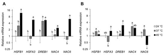 Gene expression analysis of tomato heat stress-related transcription factors. Seedlings (A) or adult plants (B) were either treated continuously at 37 °C or short exposed to 45 °C followed by recovery. Control plants were kept at 24 °C (Figure S1C,D). RNA was isolated from seedlings or young leaves harvested 24 h after the start of the treatment and expression of HSFB1, HSFA3, DREB1, NAC4 and NAC6 genes was quantified. Each biological replicate consisted of 15 seedlings or leaves pooled from 6 adult plants. The data are expressed as ΔΔCq values on a log2 scale normalized to tomato genes ACT (for leaves), or EFI-α (for seedlings) and control (24 °C). The average of 3 biological replicates with standard deviations denoted by vertical bars are presented. Different letters indicate significant differences at p < 0.05 (Tukey’s test).