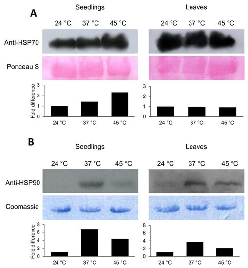 HSPs are molecular chaperones assisting protein stabilization and refolding under heat stress. To further investigate the heat stress effects on tomato, immunodetection of HSP70 and HSP90 was performed. In contrast to HSP90, which scarcely accumulated in control conditions, large amounts of HSP70 were present in seedlings and adult plant leaves (Figure 7). Heat treatments induced the accumulation of HSP70 and HSP90 proteins in seedlings but did not change HSP70 accumulation in adult plant leaves. In seedlings, HSP70 more readily accumulated at 45 °C, while HSP90 accumulation was more obvious at 37 °C (Figure 7).