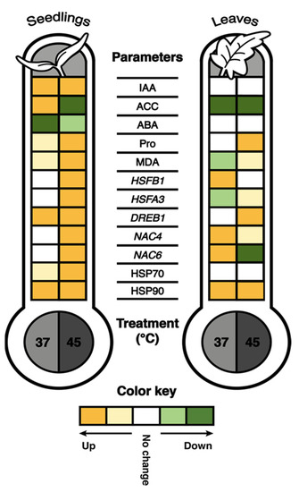 Integrated summary of heat stress effects on all parameters in tomato seedlings and adult plant leaves determined. Prolonged exposure to 37 °C and a short-term treatment at 45 °C were applied. Measured and quantified were phytohormones indol-3-acetic acid (IAA), 1-aminocyclopropane-1-carboxylic acid (ACC) and abscisic acid (ABA); heat stress markers proline (Pro) and malondialdehyde (MDA); heat stress-related transcription factors HSFB1, HSFA3, DREB1, NAC4 and NAC6 expression; and heat shock proteins HSP70 and HSP90 accumulation. Colors indicate changes under heat stress compared to corresponding controls (plants kept at 24 °C). The significant up- or downregulation at p < 0.05 (Tukey’s test) or fold change ≥ 2 (for HSP70 and HSP90) are represented by intense color. Lighter colors indicate a trend of up- or downregulation, while white displays no change.