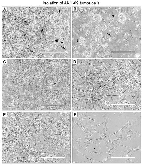 AKH-09 tumor cell isolation at different stages of development. Cells were cultivated in 1:1 hCSF/DMEM with 10% FBS in a T-25 Cell+™ culture flask. (A), the whole, mixed cell suspension on day one. (B), the whole cell suspension on day two. (C), the cell culture cleared of non-adherent cells on day 20. (D), the cells from the first subculture were used for infection assays. (E), third subculture. (F), cells grown from frozen stocks from the third subculture. Black arrows indicate the first appearance of adherent cells. White bars = 400 μm.