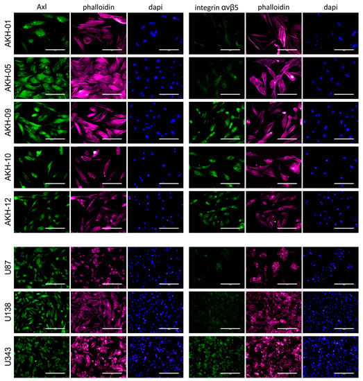 Axl and integrin αvβ5 expression in AKH tumor cells and glioma cell lines. Cells were cultured on glass slides, fixed with formalin, and then post-treated with Triton-X100. Phalloidin (red) and DAPI (blue) were used to visualize the cells and their nuclei. Bound Axl- and integrin αvβ5-specific monoclonal antibodies were detected by using a secondary anti-mouse antibody-Alexa 488 conjugate (green). Scale = 200 µm.