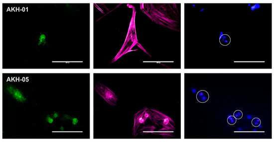 Axl and integrin αvβ5 expression in AKH-01 and AKH-05 tumor cells. Integrin αvβ5 (green) was detected in the center of the cells (AKH-01) and at sites corresponding to the bright round spots in the cell center (AKH-05, light red). At the same time, two nuclei are localized at these sites (blue). Scale = 200 µm.