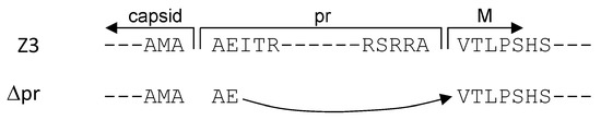 Capsid-pr and capsid-M sequence transition for Z3 and ∆pr, respectively. Z3, ZIKV envelope proteolytic cleavage sites for prME. ∆pr, the AMAAEV sequence joining the capsid to M.