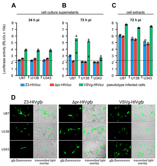 For infection of glioma cell lines U87, U138, and U343, cells were seeded in 96-well plates and infected using cell culture supernatants containing the pseudotype particles VSVg-HIVluc, Z3-HIVluc, and Δpr-HIVluc. After pseudotype infection, firefly luciferase activity in the culture supernatants was low 24 and 72 h post-infection. Thus, even shortly before the lysis of the cells, no firefly luciferase was measured in the cell culture supernatants. The 24-h values represent the luciferase activity derived from the initial COS-1 transfection supernatants. The 72-h values represent the luciferase activity released during HIV genome integration and subsequent expression (Figure 5A,B). Only the VSVg-HIVluc infected cultures had a higher luciferase background in their supernatants, which was most likely due to the weak syncytia-inducing and cell lysis effects observed in these experiments. In all infection experiments, firefly luciferase activity in the cell extracts was 2–3 log10 higher than the so-called background activity detected in the supernatants tested at 24- and 72-h post-infection (Figure 5C).