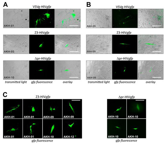COS-1 cells transfected by pNLgfpAM and pCMV-VSVg developed gfp-positive syncytia, indicating that both plasmids within the transfected cells were productive. In Figure 6A, infections are shown for AKH-01, -05, and -10, and in Figure 6B, infections are shown for AKH-09 cells. Compared to VSVg-HIVgfp infections, cells in Z3-HIVgfp and ∆pr-HIVgfp infection experiments showed partial detachment (Figure 6B). As expected from the Z3-HIVluc experiments shown in Figure 4A–C, the number of Z3- and ∆pr-HIVgfp-related gfp-positive cells were significantly lower compared to VSVg-HIVgfp infections in AKH-01 cells. In Figure 6B, data from AKH-09 infections showed that the infection rate for Z3-HIVgfp was about one-third that of VSVg-HIVgfp. In Figure 6C, more examples of Z3-HIVgfp and ∆pr-HIVgfp single-cell infections of AKH tumor cells were exemplarily shown.