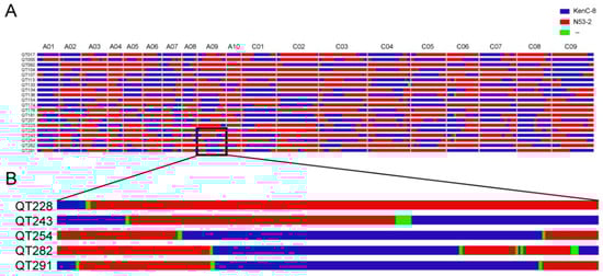 The above genotyping results were used to search the bins of the KN DH population. Here, a haplotype interval with the same genotype across the entire population, but opposite to that of the parent, was defined as a recombination bin. In total, 2522 recombination bins were obtained (Figure 1 and Table S2 in the Supplementary Materials), which represented most of the recombination events in the KN DH population, and the average interval between two adjacent bins was 440 kb. To study the recombination landscape of the KN DH population, we first measured the replacement rate of each line. For the background of KenC-8, the replacement rate ranged from 20% (line QT213) to 77% (line QT164), and similar results were also found in the background of N53-2.