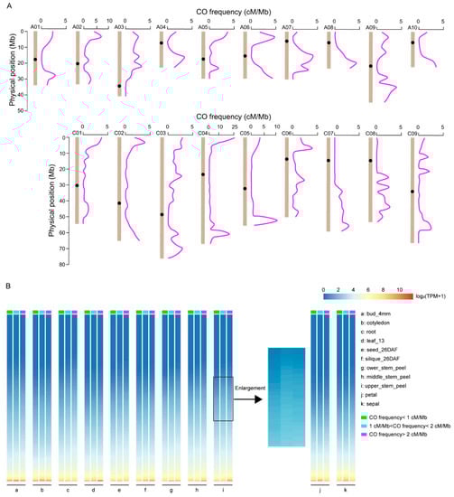 In addition, in order to compare the gene expression levels between the hot regions (regions with a CO frequency greater than 2 cM/Mb) and other regions (regions with a CO frequency less than 1 cM/Mb; regions with a CO frequency between 1 and 2 cM/Mb), we mapped all the genes to the reference genome of ZS11 (http://yanglab.hzau.edu.cn/BnIR/expression_zs11, accessed on 11 November 2022), and 51,584 genes were successfully mapped. A total of 11 tissues, such as roots, stems, leaves, seeds, and siliques, were selected for gene expression level analysis. In the petal and sepal, there were no significant differences in the average gene expression level in the different regions (Figure 2B, j–k). In the other nine tissues, the average gene expression level in the hot regions was significantly higher than that in the regions with a CO frequency of less than 1 cM/Mb (Figure 2B, a–i, Table S6 in the Supplementary Materials). These results suggested that the CO frequency of a region might be positively correlated with the expression level of its genes.