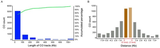 The lengths of CO and the relationships between the gene positions and CO locations. (A) CO tract lengths and their accumulated percentage. The scale distance is 100 Kb, and 700+ indicates a CO length greater than 700 Kb. (B) Potential relationships between the CO locations and gene positions. The dark brown bar indicates the number of COs close to TSS in the coding regions; the light brown bar represents the number of COs close to TTS in the coding regions; the gray bars indicate the number of COs close to TSS or TTS in the non-coding regions. The scale distance was set to 1.4 kb because the average transcript length is about 2.8 kb in the ZS11 reference genome; here, we used the median position of each CO to infer the relationships.