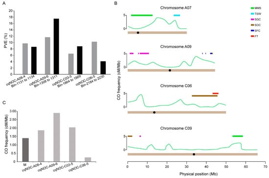 Aside from the trait of SOC, QTL for other five traits including flowering time (FT), seed glucosinolate content (SGC), seed fiber components (SFC), multi-main stem (MMS), and thousand seed weight (TSW) in the KN DH population were also successfully mapped on the bin map (Figure 5B and Figure S4 in the Supplementary Materials). Most of the QTL for these traits tended to be distributed far away from the centromere, while the MMS QTL on chromosome A07 across the centromere were rare. SFC and SOC QTL were linked to a whole interval on chromosome A09, and there was a common interval of SOC and FT QTL on chromosome C06.