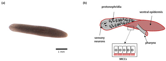 Schmidtea mediterranea: (a) Representative S. mediterranea individual–top view; (b) Schematic representation of a planarian. Tissues with cells featuring motile cilia are indicated. The red color indicates tissues/organs with multiciliated cells (MCCs).