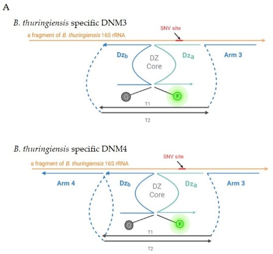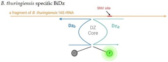 Initially, BiDz sensors based on 10–23 deoxyribozyme were used, an analogue to that used earlier for detection of E. coli cells [], quantification of mutant ribosomal RNA [], and analysis of Mycobacterium tuberculosis RNA []. The sequences of Dza, Dzb, and the reporter substrates used in this study are listed in Table S1. Two BiDz sensors targeting B. thuringiensis (Figure 2) and B. mycoides 16S rRNA were designed. The sequences of 16S rRNA were obtained from the work of Ash et al. [] and aligned (Figure S1). The sensor B. thuringiensis–specific BiDz was complementary to B. thuringiensis 16S rRNA (position 172–203). The sensor B. mycoides–specific BiDz was complementary to B. mycoides 16S rRNA (position 169–206). The design of the sensors differs in the targeted SNV and the reporter that was used. Strands B. thuringiensis–specific Dza and B. mycoides–specific Dza were complementary to a fragment of 16S rRNA containing two SNVs (192 and 197), which are shown in bold sequence in Table 1.