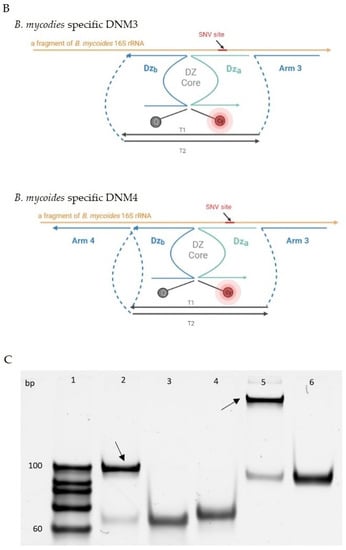 Design of DNM3 and DNM4 used in the study. (A) Design of B. thuringiensis–specific DNM3 and DNM4. DNM3 has a separate arm (Dza) and two arms (Dza and Arm 3) attached to the dsDNA scaffold (T1 and T2). DNM4 has a separate arm (Dza) and three arms (Dza, Arm 3 and Arm 4) attached to the dsDNA scaffold. Arms 3 and 4 were designed to tightly bind 16S rRNA, thereby unfolding its secondary structure. DNM3 and 4 cleaved F-sub, producing fluorescent output at 525 nm. (B) Design of B. mycoides–specific DNM3 and DNM4 was accomplished similar to that of DNMs for B. thuringiensis, but it cleaved Cy-Sub, producing fluorescent output at 617 nm. (C) Analysis of DNMs’ associations in PAGE gel: 1—Ladder; 2—DNM3 (T1, T2 strands annealed); 3—Tile strand T1; 4—T2 strand; 5—DNM4 (T1, T2′ stands annealed); 6—Tile T2′ strand (see Table S1 for sequences). The correct assembly of DNM3 and DNM4 are indicated by the arrows.