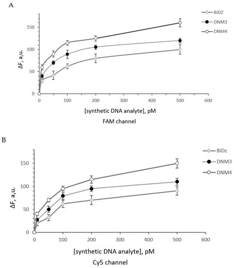 Fluorescence response of the sensors in the presence of different concentrations (0–500 pM) of the synthetic analytes (Analyte-thu and Analyte-myc, Table S1) after 1 h of incubation at 55 °C. (A) Response of B. thuringiensis–specific DNA nanosensors in the FAM channel. (B) Response of B. mycoides–specific DNA nanosensors in the Cy5 channel. Average values of three independent measurements are presented with one standard deviation. Tables S2 and S3 contain data correspond to Figure 3A and Figure 3B, respectively.