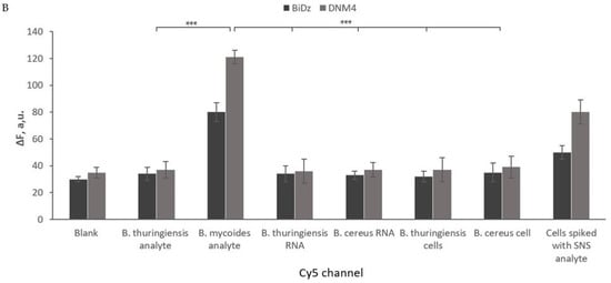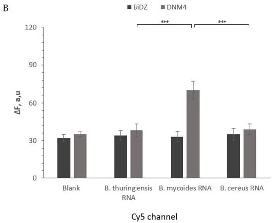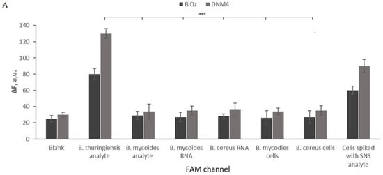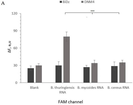 Analysis of the total bacterial RNA using BiDz and DNM4. (A) Fluorescence intensities of B. thuringiensis–specific BiDz (dark gray bars) and DNM4 (light gray bars) in the absence or the presence of 2 ng of B. thuringiensis RNA, B. mycoides RNA, and B. cereus RNA after 1 h of incubation at 55 °C in the FAM channel. (B) Fluorescence intensities of B. mycoides–specific BiDz (dark gray bars) and DNM4 (light gray bars) in the absence or the presence of 2 ng of B. thuringiensis RNA, B. mycoides RNA, and B. cereus RNA after 1 h of incubation at 55 °C in the Cy5 channel. Average values of three independent measurements are presented with one standard deviation. ***: p value < 0.001. Tables S6 and S7 contain data correspond to Figure 5A and Figure 5B, respectively.