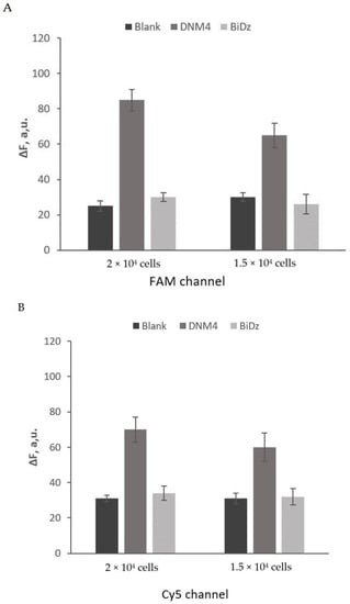 Our continuing efforts [,,,] in perfecting BiDz for the detection of nucleic acids led to the BiDz-base nanostructure, the so-called “DNA nanomachine” (DNM) []. The DNM is equipped with two more analyte-binding arms attached to the common dsDNA scaffold [,]. Such a structure was proven to enhance the sensitivity of the conventional BiDz and helped unwind the target nucleic acid due to the improved binding affinity of the arms [,,] and through displacing the complementary strand of dsDNA or fragments of the complex secondary structure of RNA. Unwinding of the target nucleic acid facilitated the formation of a signal-producing complex in an increased concentration, thus reducing the time of the assay and enhancing the fluorescent signal.