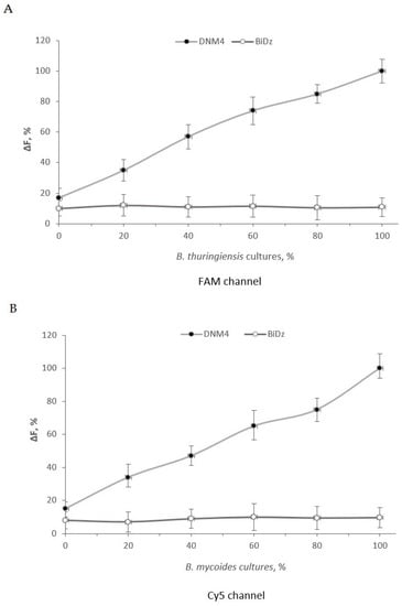 To demonstrate the applicability of the DNM sensors in cell culture with a mixture of B. thuringiensis, B. mycoides, and B. cereus rRNA, we prepared samples of B. thuringiensis cells containing different fractions of B. mycoides and B. cereus cells and samples of B. mycoides cells containing different fractions of B. thuringiensis cells and B. cereus cells. The samples were analyzed using the DNM4 and BiDz sensors. The fluorescent response of BiDzs was close to the background. As expected, the fluorescence intensity of DNMs increased with increasing percentage of the bacterial cells with maximum fluorescence triggered by the sample containing 100% of the cells (Figure 7).
