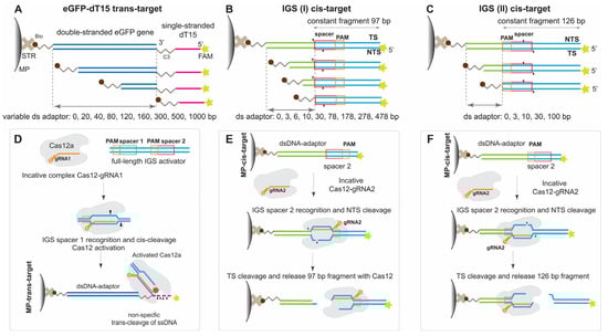 Scheme of experiments. (A) Biotin–dsDNA–ssDNA–FAM probe set (trans-target). (B) First group (IGS(I)) of cis-target constructs with a sequential arrangement of PAM, spacer, adaptor for attachment to the MP surface. (C) Second group (IGS(II)) of cis-target constructs with a sequential arrangement of the spacer, PAM, adaptor for attachment to the MP surface. (D) Trans-cleavage of the trans-target. (E) Cis-cleavage of the cis-target from the first group. (F) Cis-cleavage of cis-target from the second group. MP—magnetic particles, STR—streptavidin.