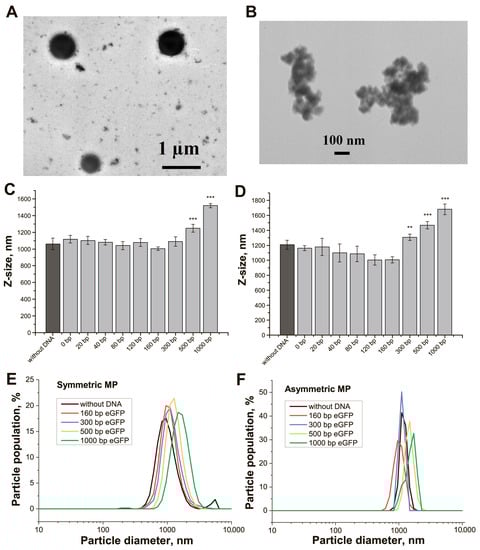 Characterization of streptavidin-MPs and their conjugates with biotinylated DNAs for trans-cleavage. TEM image of (A) SMPs, (B) AMPs. Dh values of (C) SMPs and their conjugates, (D) AMPs and their conjugates. Dh distribution for (E) SMPs and their conjugates, (F) AMPs and their conjugates. Difference from control (dark gray column): **-p-value < 0.05%, ***-p-value < 0.01%.