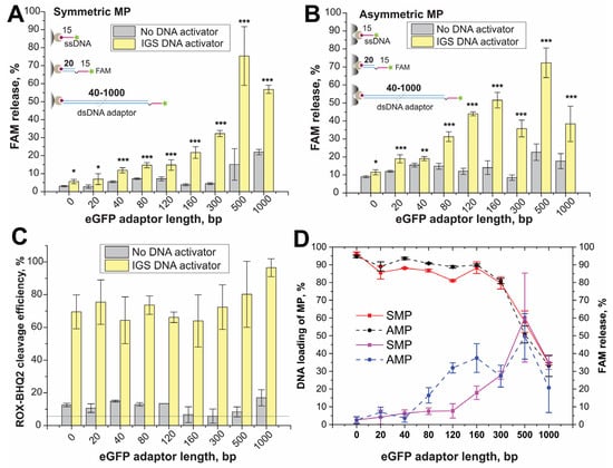 Trans-cleavage of trans-targets conjugates differing the eGFP adaptor length for (A) SMPs, (B) AMPs. Unpaired t-test p-values for corresponding raw signals are shown as asterisks: *-p < 0.1, **-p < 0.05, ***-p < 0.001 (C) Trans-cleavage of ROX–dT15–BHQ2 probe (100 nM) as internal control dash line represents the ROX–BHQ2 signal in the buffer. (D) Dependencies of trans-cleavage efficiency (blue and purple lines) and ds-ssDNA loading of MPs (red lines) on adaptor length. The values of negative controls were subtracted. The fluorescence of the released FAM after cleavage was normalized to an effective concentration of DNA targets in the conjugate and estimated as % of the released FAM.