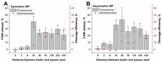 Cis-cleavage of DNA (IGS(I))–streptavidin–MP conjugates differing in the ds-adaptor length between spacer (20 bp) and the MP surface. (A) SMPs conjugates, (B) AMPs conjugates. Fluorescence values are depicted as gray bars. Efficiency values of cleavage according to gel-electrophoresis are depicted as red dots.