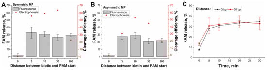 These results showed that the influence of the close location of the MP surface on PAM recognition was less than that on the cis-cleavage site close to the MP surface (Figure 4A). However, the cis-cleavages for both cis-targets groups showed the sharp change in the efficiency upon reaching an appropriate distance from the MP surface and similar constant efficiency (20–40%) for longer lengths. Summarizing all results about cis-cleavage, we concluded that the arrangement in the direction of the MP surface, PAM, and spacer was preferred for binding the cis-target to MPs. The minimal adaptor length following PAM required for this binding corresponded to 3 bp.