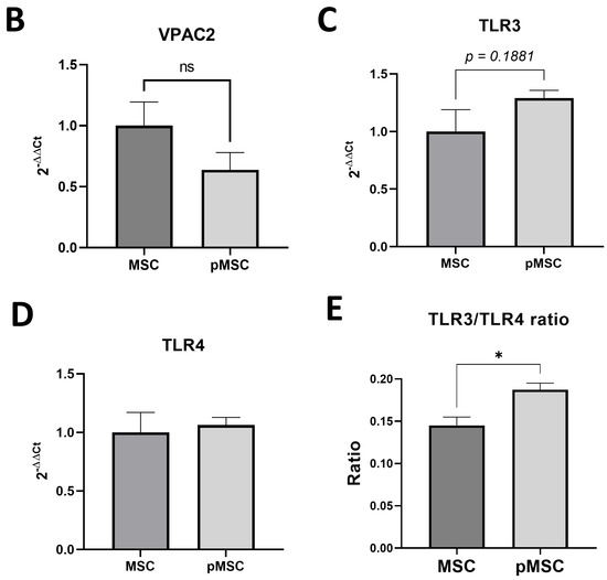 Total RNA was extracted from MSC culture using an RNeasy Purification mini kit (QIAGEN, cat no. 74104) according to the manufacturer’s protocol. RNA was quantified according to absorbance at 260 nm, measured using the NanoDrop 2000. Then, 1 µg of total RNA was reverse transcribed using GoScript™ Reverse Transcription System (Promega, cat No. A5003). After reverse transcription, real-time PCR analysis by real-time PCR QuantStudioTM machine was conducted for the expression of TLR3 and TLR4 using LightCycler SYBR Green I Master (Roche, cat No. 04887352001) according to the manufacturer’s instruction with 300 nM primers concentration. GAPDH gene was used for sample normalization. Amplification was performed under the following conditions: 5 s denaturation at 95 °C, followed by 30 s annealing at 59 °C and then followed by 30 s extension at 72 °C for a total of 40 cycles. Primer pairs used were TLR3 forward 5′-TTGTCTTCTGCACGAACCTG-3′ and TLR3 reverse 5′-CGCAACGCAAGGATTTTATT-3′; TLR4 forward 5′-ACCTGGCTGGTTTACACGTC-3′ and TLR4 reverse 5′-CTGCCAGAGACATTGCAGAA-3′; GAPDH forward 5′-GGGGCTCTCTGCTCCTCCCTGT-3′ and GAPDH reverse 5′-TGACCCTTTTGGCCCCACCCT-3′; VPAC1 forward 5′-CAAGGATATGGCCCTCTTCA–3′ and VPAC1 reverse 5′- TGATGAACACACTGGGCACT-3′; VPAC2 forward 5′-CAGATGTTGGTGGCAATGAC-3′ and VPAC2 reverse 5′-CCTGGAAGGAACCAACACAT-3′; PAC1 forward 5′-GACCTGATGGGCCTAAATGA -3′ and PAC1 reverse 5′-GCCAGAATCCCCTATGGTTT–3′. primers were synthesized commercially (Sigma-Aldrich). PCR product specificity was confirmed using melting curve analysis and relative gene expression was calculated as 2(−ΔΔCT).