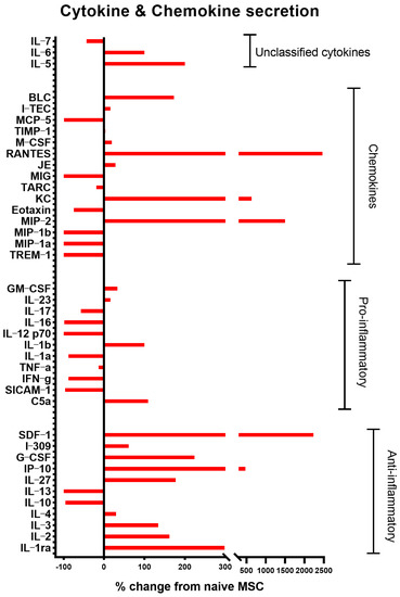 PACAP polarizes MSC towards an anti-inflammatory (MSC2) phenotype. Conditioned medium from naïve and PACAP-treated MSC was analyzed for chemokines and cytokines secretion, utilizing Proteome Profiler Mouse Cytokine Array (R&D Systems). The following chemokine and anti-inflammatory cytokines IL-2, IL-3, IL-4, IL-27, IP10, IL-1ra, RANTES, SDF-1, CCL2(JE), CCL1 (i-309), G-CSF, BLC were upregulated, while pro-inflammatory cytokines were downregulated (IL-6, IL-1a, IFN-ɣ and soluble ICAM-1). Analysis was performed on pooled samples (n = 3) for each culture.