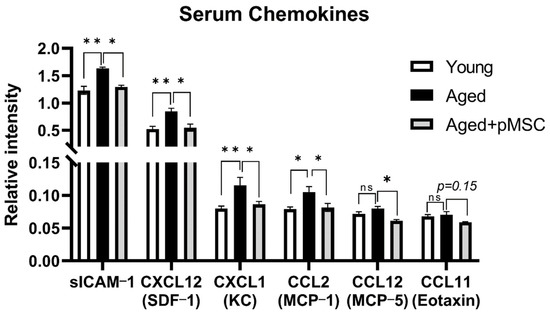 Systemic administration of polarized MSC to aged mice normalizes systemic chemokine levels. Intravenous injection of polarized anti-inflammatory MSC (pMSC, N = 3–4) reduces the levels of plasma chemokines that are associated with aging and inflammation [4] to levels of young (3 months old) mice (N = 7–8) compared with vehicle-treated aged control mice (N = 3), as detected by Proteome Profiler Mouse Cytokine Array (R&D Systems). Bars in the graph present mean ± SE. * p < 0.05, ** p < 0.01. One-way ANOVA. ns = non-significant.