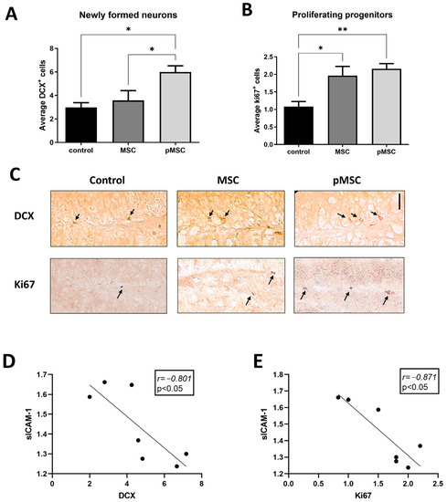 We further assessed whether polarized MSC influence the reduced hippocampal neurogenesis, one of the characteristics of brain aging. Three weeks following the administration of polarized MSC, but not of naïve MSC (2 × 105 cells i.v.), increased hippocampal neurogenesis was evident, as reflected by an increase in the number of DCX+ newly formed neurons in the granular cell layer of the dentate gyrus (Figure 4A). Additional staining for proliferating Ki67+ progenitors in the subgranular zone showed an increase in proliferating cells in aged male mice treated with both polarized MSC and naïve MSC (Figure 4B). Interestingly, inverse correlation was observed between sICAM-1 serum levels and the number of DCX+ cells (Pearson r = −0.8, p < 0.05, n = 7) and Ki67+ cells (Pearson r = −0.87, p < 0.05, n = 7) in the dentate gyrus of aged animals (Figure 4C,D).