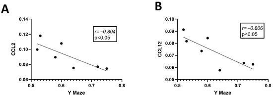 Cognitive behavior correlates with chemokine serum levels in aged mice. Linear regression graphs depicting the correlation between CCL2 and CCL12 serum levels and behavioral performance in the Y-maze test (A,B), respectively (N = 7). Correlations were calculated using Pearson test.