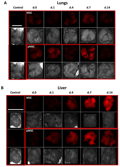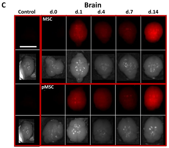 MSC engraft to various organs following intravenous injection in mice. DiR labeled naïve and polarized MSC (2 × 105) were injected into the tail vein of 3-month-old mice. Labeled cells were detected using the Maestro in vivo imaging system at days 0, 1, 4, 7, and 14 following the injection. Imaging was performed and presented for the following dissected organs: (A) lungs (scale bar = 1 cm), (B) liver (scale bar = 3 cm), and (C) brain (scale bar = 1.5 cm). In each organ, the negative control (vehicle injected animal) is presented in the left rectangle, naïve MSC engrafted organ in the upper right and polarized MSC (pMSC) in the lower right rectangle. In each rectangle, the upper photographs represent fluorescent detection of DiR signal in the organ and the corresponding lower photograph, a visual light image of the same organ.