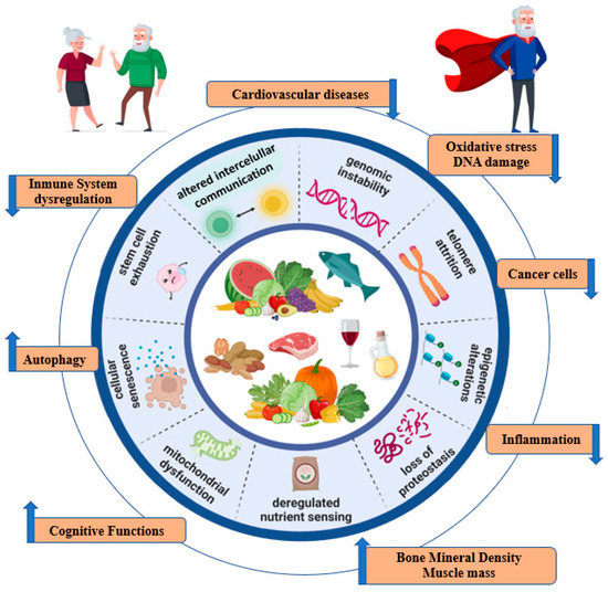 Several cellular and molecular hallmarks are involved in the aging process. In particular, there are nine hallmarks that are decisive in the aging process: genomic instability, telomere attrition, epigenetic alterations, loss of proteostasis, the dysregulation of nutrient sensing, mitochondrial dysfunction, cellular senescence, stem cell depletion, and altered intercellular communication [5]. These molecular mechanisms are involved in the development of age-related diseases such as cancer, obesity, diabetes, cardiovascular disease (CVD), and neurodegenerative diseases [3]. These age-related diseases have been associated with risk factors that can be modified mainly through nutrition, which constitutes one of the pillars of health [6]. In addition, the microbiota, which is modified by diet, has also been involved in aging [6]. It has been suggested that the age-related decline in immune system function (immunosenescence) and chronic low-grade inflammation could lead to microbiota disturbances that are associated with several age-related pathologies. Thus, it has been argued that a balanced diet can modulate the proliferation of specific bacteria within the gut microbiota. This has been associated with improved health status in older people [7].