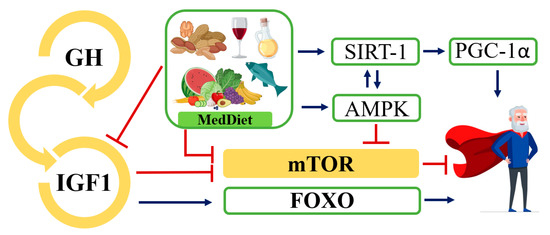 Dysregulated nutrient sensing pathways. Overview of the somatotropic axis, involving GH and the IIS pathway. Molecules that promote aging are shown in yellow, while molecules with anti-aging properties are shown in light green. Red lines indicate inhibited or slowed pathways and blue lines indicate activated pathways that together promote healthy aging. GH, growth hormone; IGF-1, insulin-like growth factor-1; mTOR, protein mammalian target of rapamycin; AMPK, adenosine monophosphate-activated protein kinase; FOXO, Forkhead Box; PGC-1α, peroxisome proliferator-activated receptor gamma 1-alpha; SIRT-1, sirtuine-1.