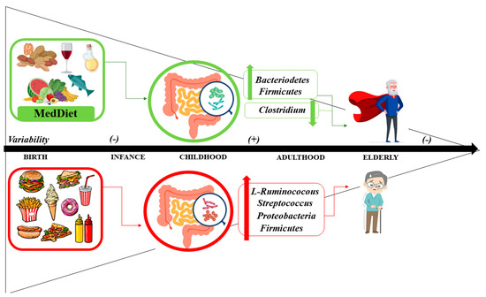 The intestinal microbiota has its origin in the placenta, with low levels of non-pathogenic bacteria, mostly Bacteroidetes, and Firmicutes. After birth, the intestine of the newborn and infant is rapidly colonized. Factors such as the type of delivery (vaginal or caesarean) or the type of feeding (breastfeeding or formula feeding) are determinants of the microbiota [333]. During the first three years of life, the microbiota has low diversity. After the third year, the microbiota is similar to that of the adult stage. With aging, changes occur in the morphology and function of the microbiota. Thus, after 65 years of age, the microbiota experiences a decrease in Firmicutes and Bifidobacterium, with an increase in diversity for Clostridium [28].