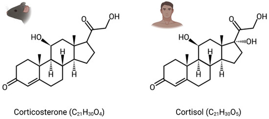 GCs are the main stress steroid hormones and can easily cross the blood–brain barrier (BBB) because of their lipophilic structure. They are cortisol in humans and corticosterone in rodents, which differ structurally through one hydroxy group (Figure 1). Termed tonic or phasic, GC secretion is modulated by the circadian rhythm and in response to stress. While stable basal levels are maintained by tonic secretion (i.e., 1 µg/100 mL in plasma), phasic secretion is engaged at the beginning of the active phase and during environmental stimulation, resulting in higher levels of circulating GCs (i.e., 10 µg/100 mL) [30]. Furthermore, their secretion in response to stress can increase basal levels by a factor of over 40 [31].