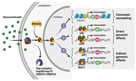 At the cellular level, 11β-hydroxysteroid dehydrogenase (11β-HSD) type I and II enzymes regulate the availability of intracellular GCs and thus their ability to activate their receptors, which are mostly localized in the intracellular shaft. In fact, GCs are able to bind two cytoplasmic receptors: the mineralocorticoid and glucocorticoid receptors (MRs and GRs), which are transcription factors that cooperate through genomic but also rapid nongenomic mechanisms to coordinate acute and chronic stress responses associated with peripheral neuroendocrine and central social, cognitive, and emotional processes [36,37]. However, GCs having a stronger affinity for MRs than GRs results in MRs being saturated at the hormone’s basal levels. Therefore, GRs are significantly activated only when hormone levels are high, such as those observed during circadian peak and environmental challenges. For this reason, GRs are considered the main stress receptor. They are expressed throughout peripheral tissues such as the lung, heart, liver, kidney, etc., but also in many cerebral structures [38]. Indeed, GRs are found in numerous brain regions and different neural (neurons, glial cells) and non-neural (endothelial) cell types. Their expression level is particularly high in the HPC, notably in the dorsal area [39,40]. This limbic region, which encodes contextual and spatial memory, is strongly modulated by emotions and is thus involved in the etiology of many psychiatric disorders such as anxiety, depression, and PTSD [41]. In the absence of GCs, GRs are found in the cytoplasm as a conformationally inactive protein complex with chaperones immunophilin FK506-binding proteins (FKBP) and heat shock proteins (Hsp). After binding to GCs, they are activated by phosphorylation and translocated into the nucleus where they modulate, as homo- or heterodimers, gene transcription through three known mechanisms: (1) remodeling chromatin via the recruitment of enzymes affecting histone post-translational modification and DNA methylation [42,43], (2) direct DNA binding on glucocorticoid-responsive elements (GREs) or negative GRE (nGRE) sequences present in the promoter region of target genes [36,44,45], and (3) interaction with other transcription factors, such as Jun, CREB, Fos-Jun, and NfκB [36,44,45] (Figure 3). The various modulations produced by translocated GRs lead to the downstream molecular and behavioral effects of phasic GC secretion.