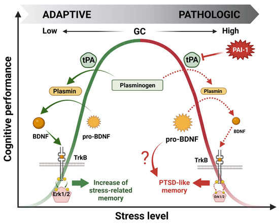 Our latest work was focused on the deleterious effect of GCs on cognitive performance. Our hypothesis was that the deregulation of the GMES cascade in the HPC could be responsible for a shift from normal to pathological memory such as that observed in PTSD patients. Searching for effectors able to downregulate the whole GMES cascade, we targeted PAI-1, the role of which is to inhibit tPA. Interestingly PAI-1 is also expressed in the HPC and contains GREs in its promoter region [3]. Indeed, using a mouse model displaying the paradoxical memory features of PTSD (i.e., contextual amnesia and emotional hypermnesia) [15], we showed that the deregulation of the GMES signaling cascade via an increase in PAI-1 induced by intense or traumatic stress was responsible for the formation of pathological memory, modeling important aspects of PTSD [29] (Figure 4). The dynamic modulation of the tPA/PAI-1 balance has provided insight regarding the paradoxical duality of the bell-shaped behavioral effects of GCs being able to regulate both tPA and its inhibitor PAI-1. Our data thus help to explain how GCs can have opposite functional and behavioral effects: stimulating for moderate stress and deleterious for intense stress such as chronic or traumatic stress. In addition to GMES cascade inhibition, an increase in PAI-1 levels is responsible for pro-BDNF accumulation by blocking its conversion into m-BDNF by the tPA/plasmin system. Long considered inactive, pro-BDNF forms are actually able to form a ternary complex with p75NTR and sortilin pro-apoptotic receptors to induce neuronal cell death by apoptosis [53] and decrease synaptic plasticity (LTD induction) [54], in contrast to BDNF/TrkB signaling, which is known to promote long-term potentiation (LTP) [55]. Thus, pro-BDNF accumulation could also be involved in the physiopathology of the impaired cognitive function observed in this mouse model (Figure 4).