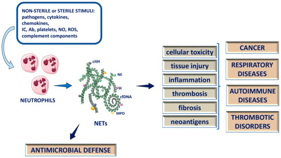 However, most of the data indicate that NET components, such as circulating cfDNA, extracellular histones and granule proteins, are cytotoxic, pro-inflammatory and promote tissue injury, fibrosis and coagulation [87,97,168,169,170,171] (Figure 1). Several chronic inflammatory diseases, regardless of the cause (sterile or non-sterile) of inflammation, are marked by a continued influx of neutrophils and sustained NETs release. In respiratory chronic diseases such as cystic fibrosis (CF) and chronic obstructive pulmonary disease (COPD), persistent NET formation, which is associated with inflammation and disease severity, was found [87,172,173]. Neutrophils and NETs may play a critical role in autoimmune diseases such as systemic lupus erythematosus (SLE) and rheumatoid arthritis (RA) [92,174,175]. Villanueva et al. [92] reported that a distinct low-density granulocyte (LDG) population found in SLE patients demonstrated their tendency for spontaneous NET formation and the upregulation of proteins and enzymes expression implicated in NET formation and autoimmunity. There is growing evidence that these NETs also expose double-stranded DNA, an autoantigen implicated in lupus pathogenesis, through the induction of IFN-α synthesis by plasmacytoid dendritic cells [92,176]. It is shown that RA neutrophils have activated NF-κB signaling, leading to delayed apoptosis [177]. The authors further showed that RA synovial fluid (SF) neutrophils have an altered phenotype, increased expression of chemokines, FcγR1 and MHC II, decreased apoptosis and increased ROS and NET production [175]. In cancer development, when the body’s inflammatory response to tissue damage caused by either physical or ischemic injury, or infection, becomes chronic, cell mutation and proliferation can result, creating an environment that favors cancer evolvement and progression [178]. Demers et al. [95] showed, in murine models of chronic myelogenous leukemia (CML), breast, and lung cancer, that a systemic environment is created in cancers, which can induce an increase in peripheral blood neutrophils, predisposed to NET formation. It has been reported that NETs induced by a pro-inflammatory trigger can mediate the proteolytic remodeling of the laminin, matrix component, to divulge a novel epitope that triggers the proliferation of quiescent cancer cells via integrin activation [94,179]. Additionally, it is shown that NET components promote cancer-associated thrombosis and cancer cell proliferation, migration and metastasis [93,94,95].
