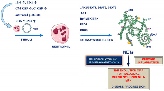 Signaling pathways and regulatory molecules, such as JAK, STAT, AKT and Raf-MEK-ERK, which may regulate NET formation in normal neutrophils or neutrophils under pathological conditions [100,103,104,105], are upregulated in MPNs, as components of JAK2-STAT signaling pathways [5,12,14,15,16,17,18,34]. Furthermore, MPN neutrophils are characterized by the upregulation of JAK target genes, regardless of JAK2 mutational status [17]. Therefore, it is reasonable to speculate that clonal neutrophils are an important source of NET generation in MPNs (Figure 2).
