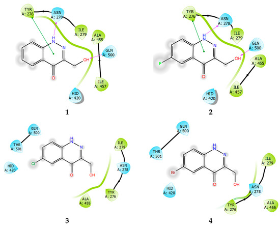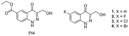 - Babushkina, A.A.; Mikhaylov, V.N.; Novikov, A.S.; Sorokoumov, V.N.; Gureev, M.A.; Kryukova, M.A.; Shpakov, A.O.; Balova, I.A. Synthesis, X-ray and DFT Studies of 6-halo-3-(hydroxymethyl)cinnolin-4(1H)-ones. Chem. Heterocycl. Comp. 2022, 58, 432–437. [Google Scholar] [CrossRef]