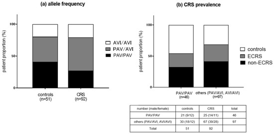 (a) Proportions of the PAV/PAV allele and other alleles (PAV/AVI and AVI/AVI) in the control and CRS groups. (b) CRS prevalence classified by TAS2R38 gene polymorphisms (PAV/PAV vs. PAV/AVI and AVI/AVI alleles).