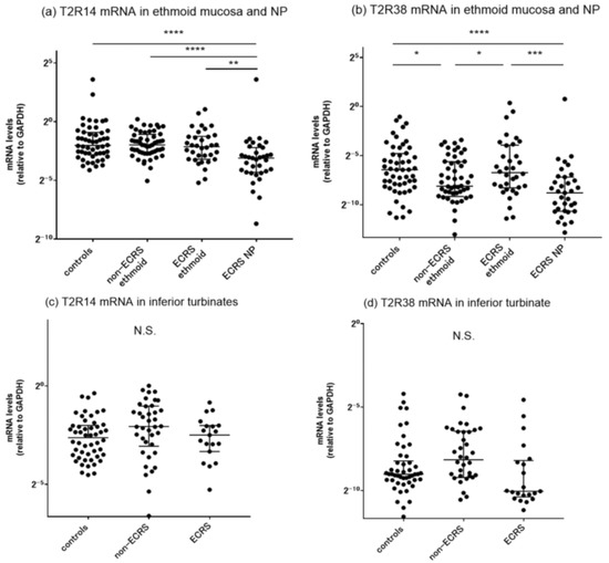Comparison of mRNA expression in ethmoid sinus, nasal polyps, and inferior turbinate mucosae from controls, non-ECRS, and ECRS patients as detected by RT-PCR. (a,c) T2R14 and (b,d) T2R38 mRNA levels were quantitatively normalized to the GAPDH mRNA levels. * p < 0.05; ** p < 0.01; *** p < 0.001; **** p < 0.0001. Center lines, median values; error bars: interquartile ranges; N.S., not significant.