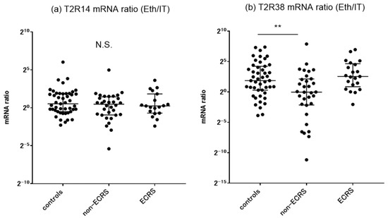 Comparison of the mRNA expression ratios of ethmoid sinus to inferior turbinate mucosa (Eth/IT ratio) for each subject in the control, non-ECRS, and ECRS groups. (a) T2R14 and (b) T2R38. ** p < 0.01. Center lines, median values; error bars, interquartile ranges; N.S., not significant.